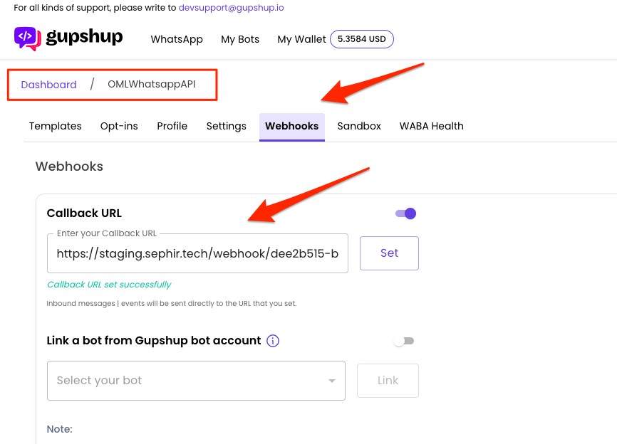 To do this, within the GupShup Dashboard, click on the Application that we have instantiated to handle Whatsapp Business events (in the example, "OMLWhatsappAPI") and access the Webhooks tab, where we proceed to set the Callback URL with the following format: