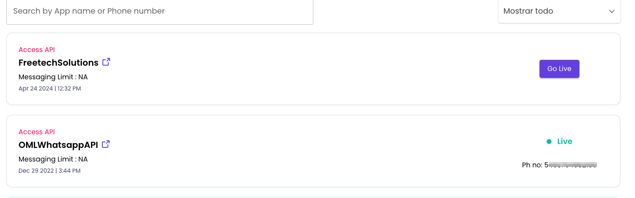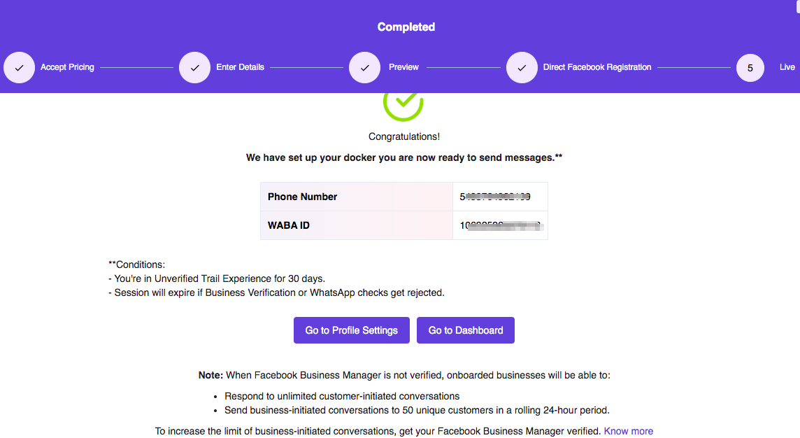 Step 9: Finally, the process of linking WhatsApp Business and Facebook Business Manager is complete. As soon as Meta approves the WABA account (1 to 2 business days according to documentation), GupShup will reflect its "live" status within its Dashboard and it is now possible to use Meta's APIs safely: