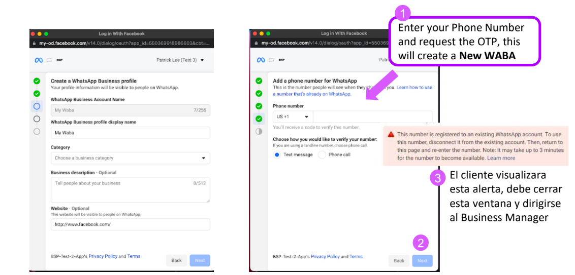 Step 5: Enter the WhatsApp phone number from which the new WABA will be created.