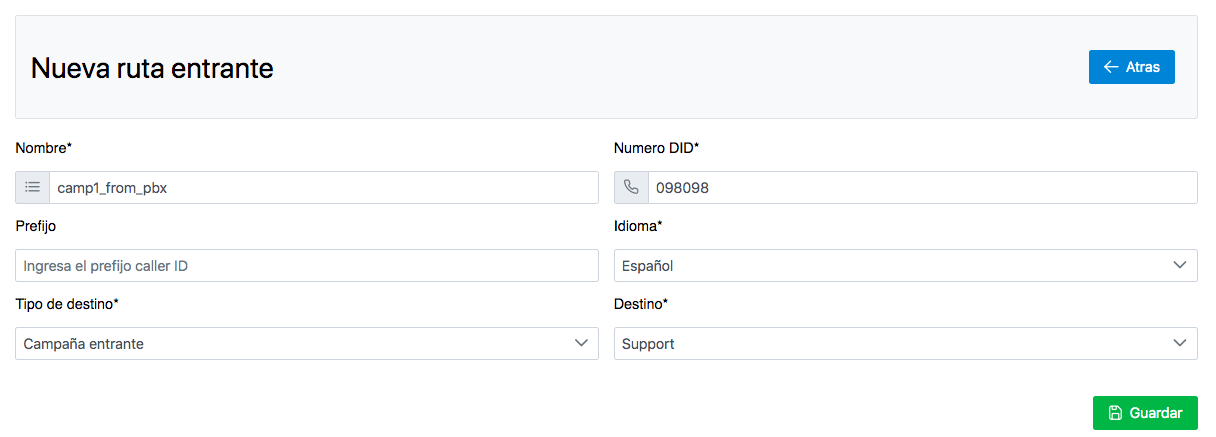 The number to be sent by the trunk has to match the DID of the OMniLeads incoming route. In this way, any extension of the IP-PBX will be able to dial or transfer a call to this custom extension and it will be sent to the corresponding incoming route in OMniLeads, to finally connect to an incoming campaign or the element assigned as the destination of the incoming route in OMniLeads.
