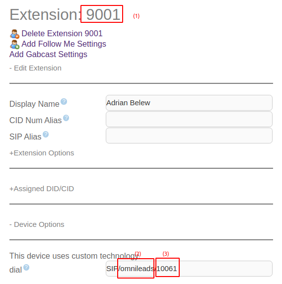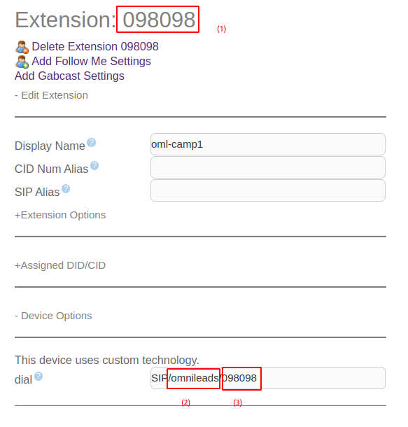 In the figure we highlight 3 elements: The extension number does not necessarily have to be identical to the number sent to OMniLeads (3). It can be any number, as long as the Dial string of the custom extension matches the DID of the OML incoming route (098098 for our example).
