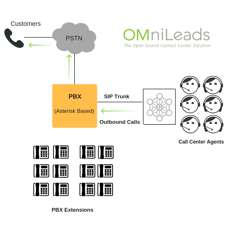 Finally, we are going to generate outbound routing within OMniLeads, which allows agents and dialers to launch calls to the PSTN on the one hand, while allowing agents to dial or transfer calls to IP-PBX resources such as extensions, ring groups, call queues, etc., on the other hand.