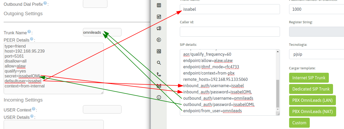 At this point, there is a SIP trunk between both telephone systems, leaving the configuration of call routing between both systems pending. Finally, we put emphasis on relating parameters between the SIP trunk configuration in Issabel with that of OMniLeads. A picture is worth a thousand words: