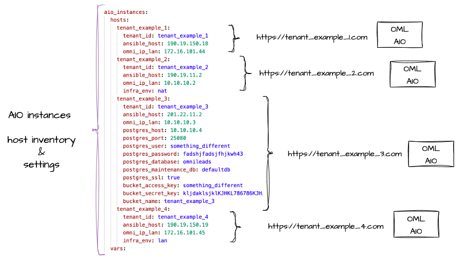 Below is a generic inventory file for a typical deployment in the AIO scheme. In its first section, the different hosts are listed by tenant and by type of deployment to be executed (aio_instances):