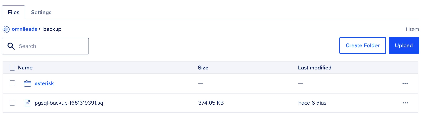 Within the bucket, you'll find a backup folder containing a .sql file preceded by the execution timestamp. Additionally, another directory will hold the corresponding Asterisk backups.