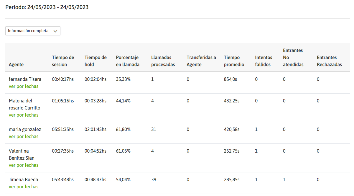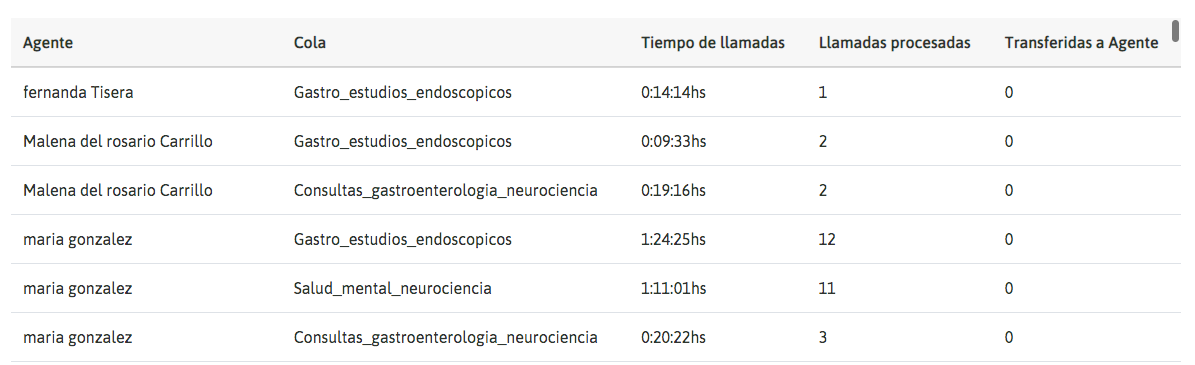 The next parameter to be broken down has to do with the number of calls processed by each agent in terms of campaigns. That is, a detail is presented for each agent of how many calls and how much time they spent on each of the campaigns for which they processed their calls.