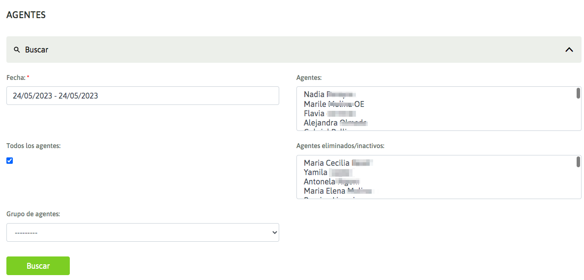 When accessing the Reports -> Agents menu, a view is displayed that allows us to select the agent or group of agents on one side, and the date or date range on the other, which allows us to filter the output of the agent activity report.