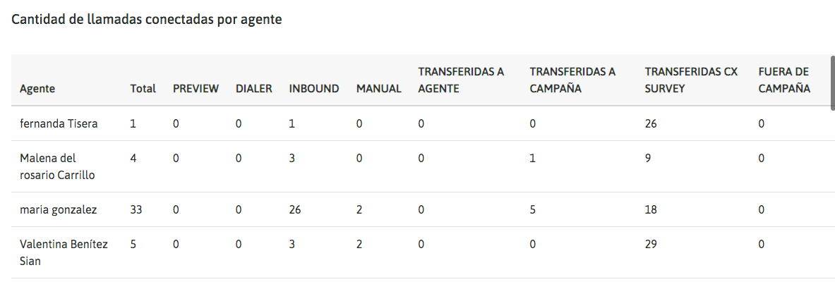 Finally, a table is presented detailing the number of calls of each type (manual, preview, dialer and incoming) in which the agent was involved.&#x20;