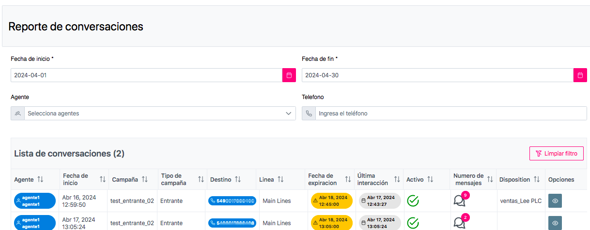 The Conversations Report allows the Campaign to display chats (active, inactive, qualified, unqualified, etc.) to have control over agent conversations and to be able to carry out online monitoring. From a Filter by Date, Agent and Phone, it is possible to obtain a list of conversations within said filter, with sufficient management information: