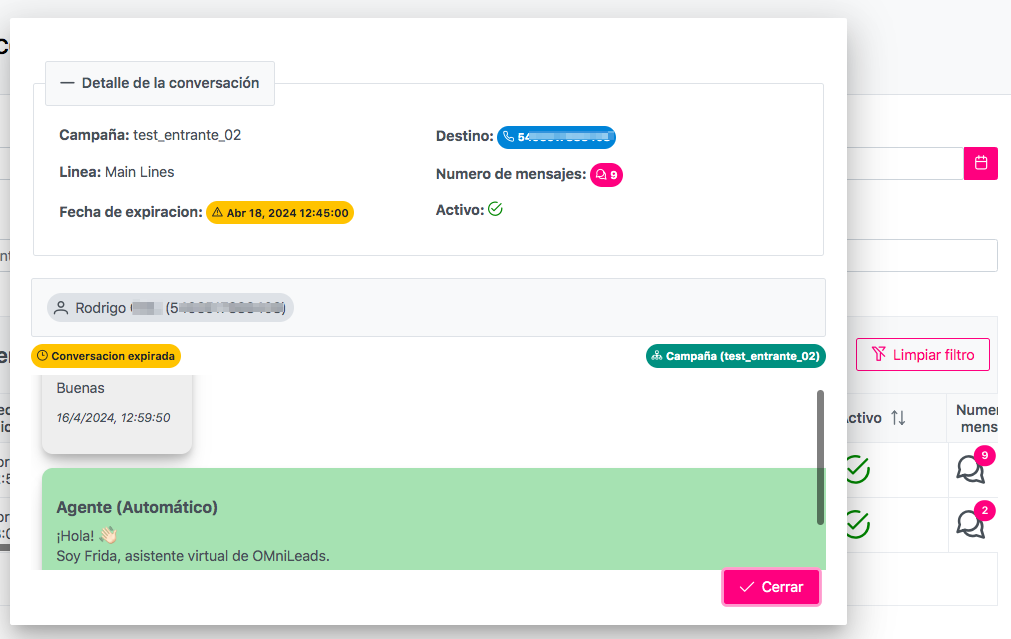 * Expiration Date: future date on which the conversation will expire. If it must be resumed, it is necessary to use WhatsApp Outgoing Templates.&#x20;