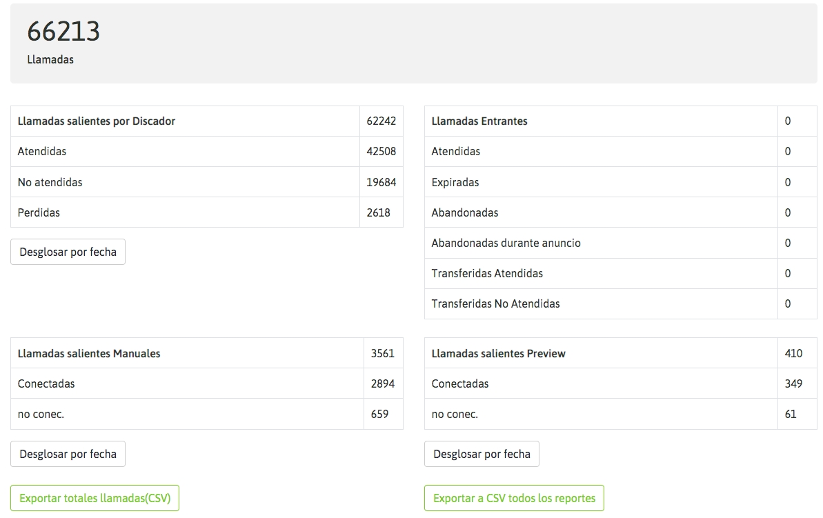 In the following 3 sections, a tabular and graphical breakdown of all calls processed by OMniLeads is presented in terms of their nature (incoming, manual, preview and predictive) and in turn, within each of these classifications, a breakdown is made into the specific campaigns for each type of call. By selecting one of the active campaigns, we can have the information broken down by day, in the case that we are looking for a range of more than one day. In this way, the effectiveness of each campaign can be quickly deduced from the presentation of the information both tabularly and graphically.