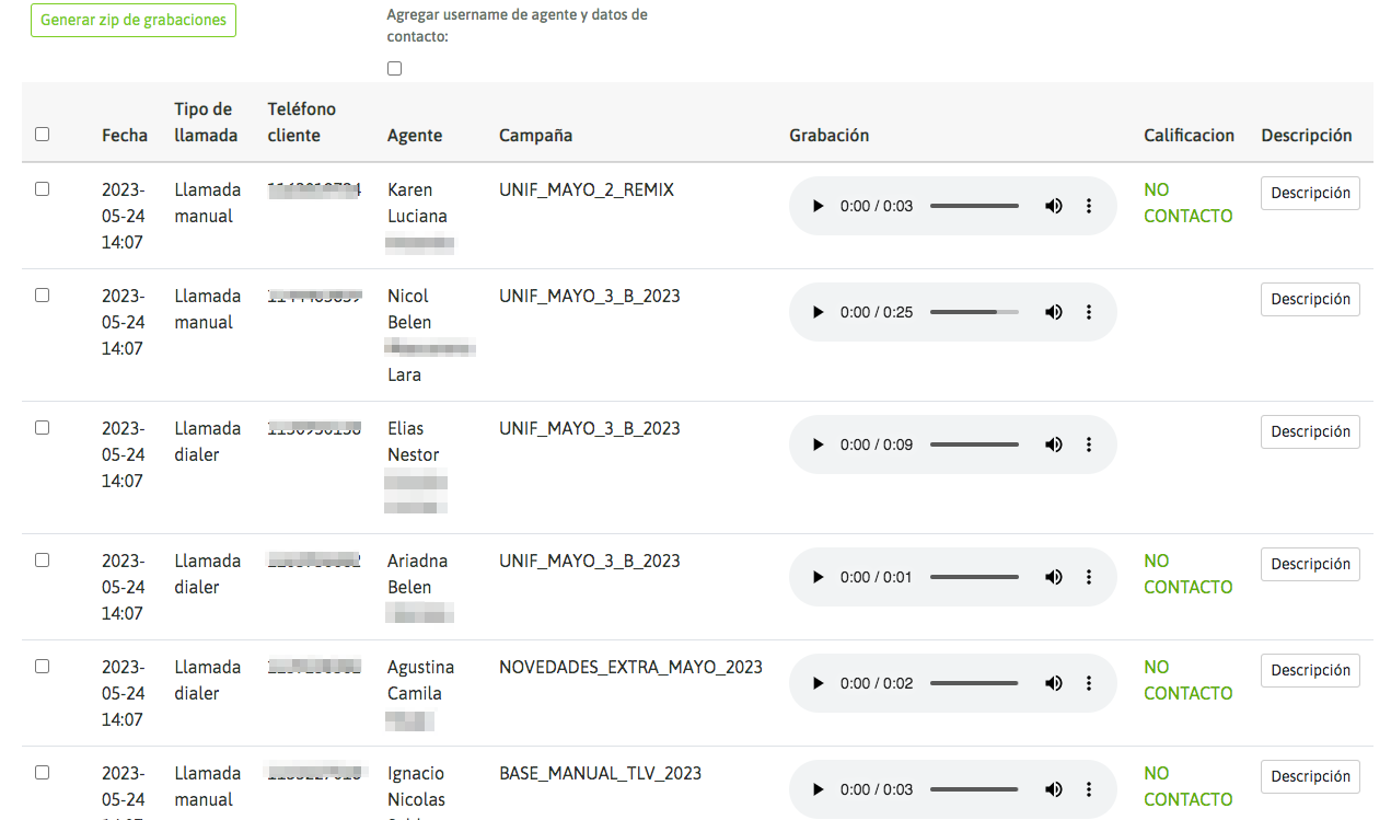 * Generate recording zip: Once the recordings are listed, we can select all the ones that the page allows and download them in zip format. The "Add agent username and contact data" option can be checked to obtain a CSV report with all the contact information (metadata).