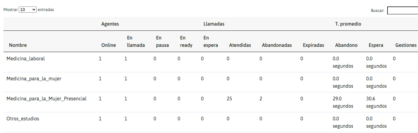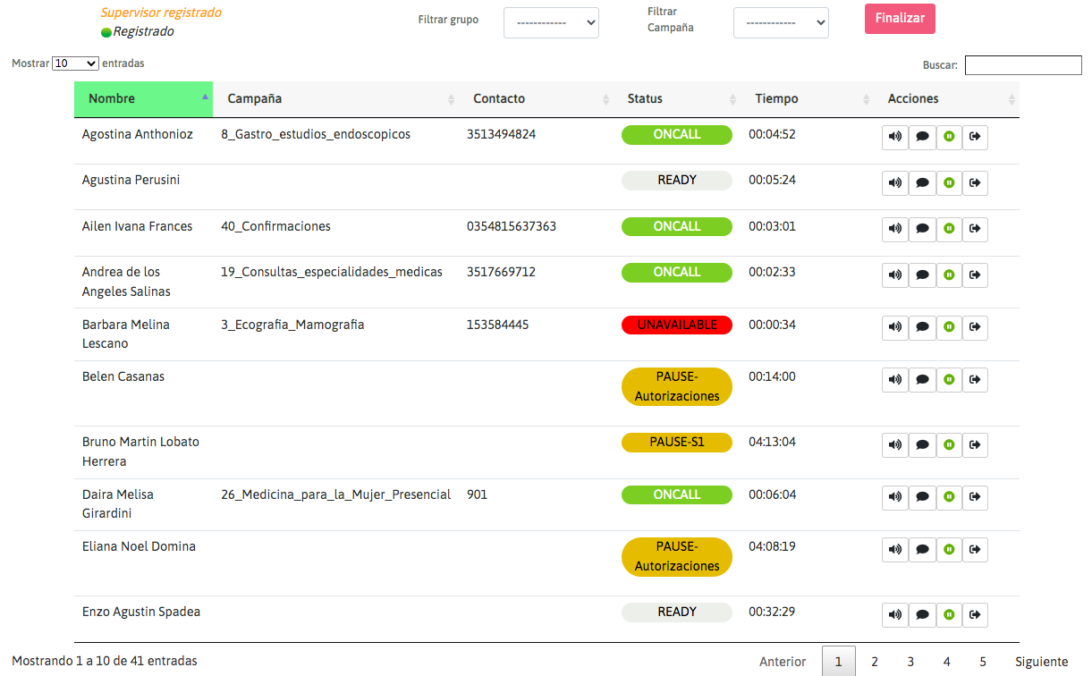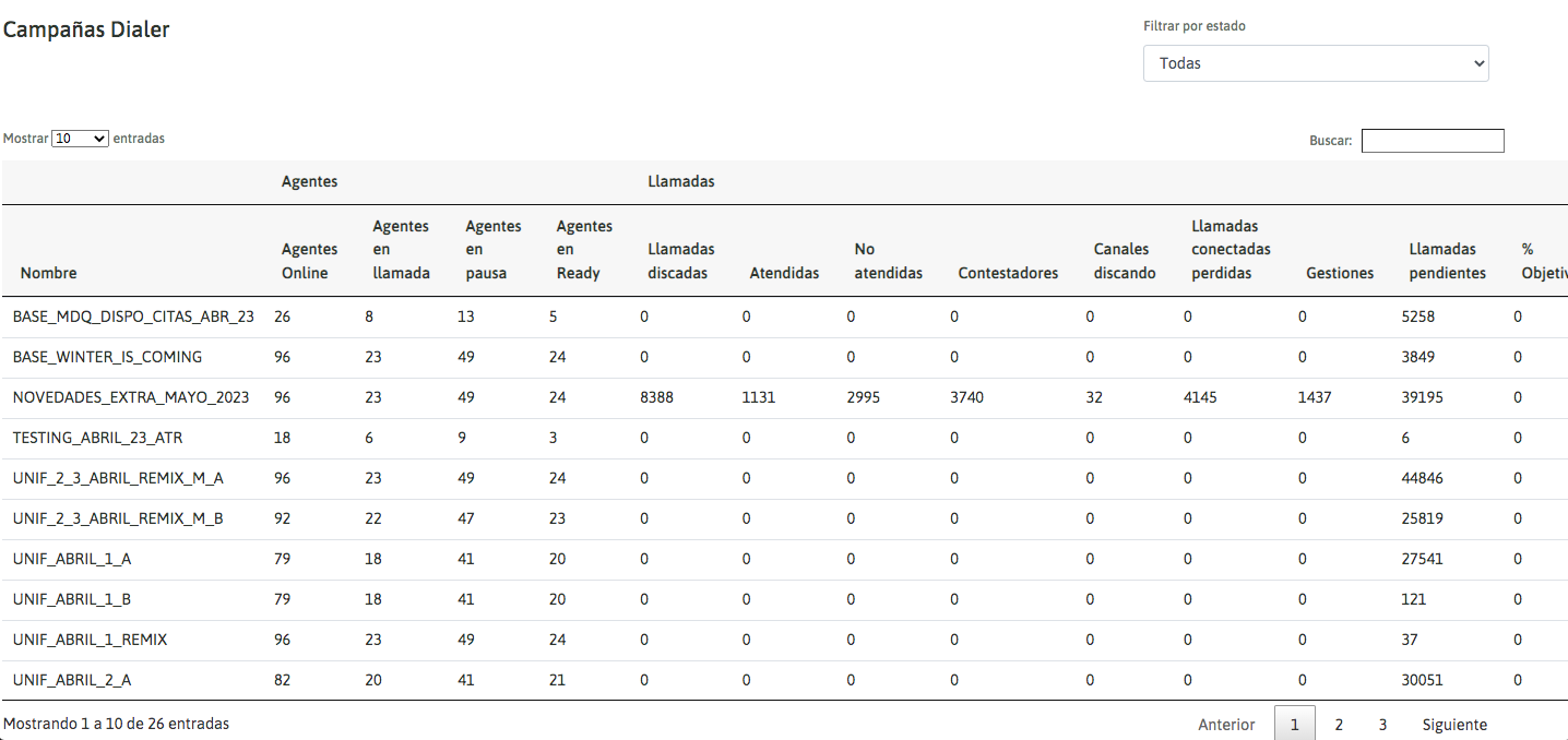 Dialer campaigns also have a summary updated in real time, on the one hand, the availability of agents, agents online, agents on call, agents on pause, and on the other, the availability of calls, dialed, answered, unanswered, answering machines, channels dialing, missed connections, management and pending calls.