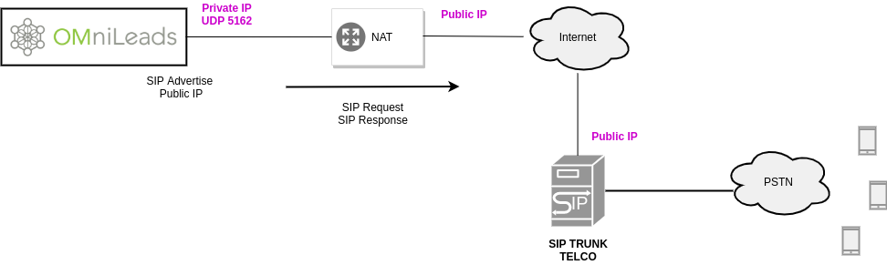 When declaring the SIP trunk on the other end, keep in mind that OMniLeads will use the SIP UDP port 5162 in these NAT environments. Important