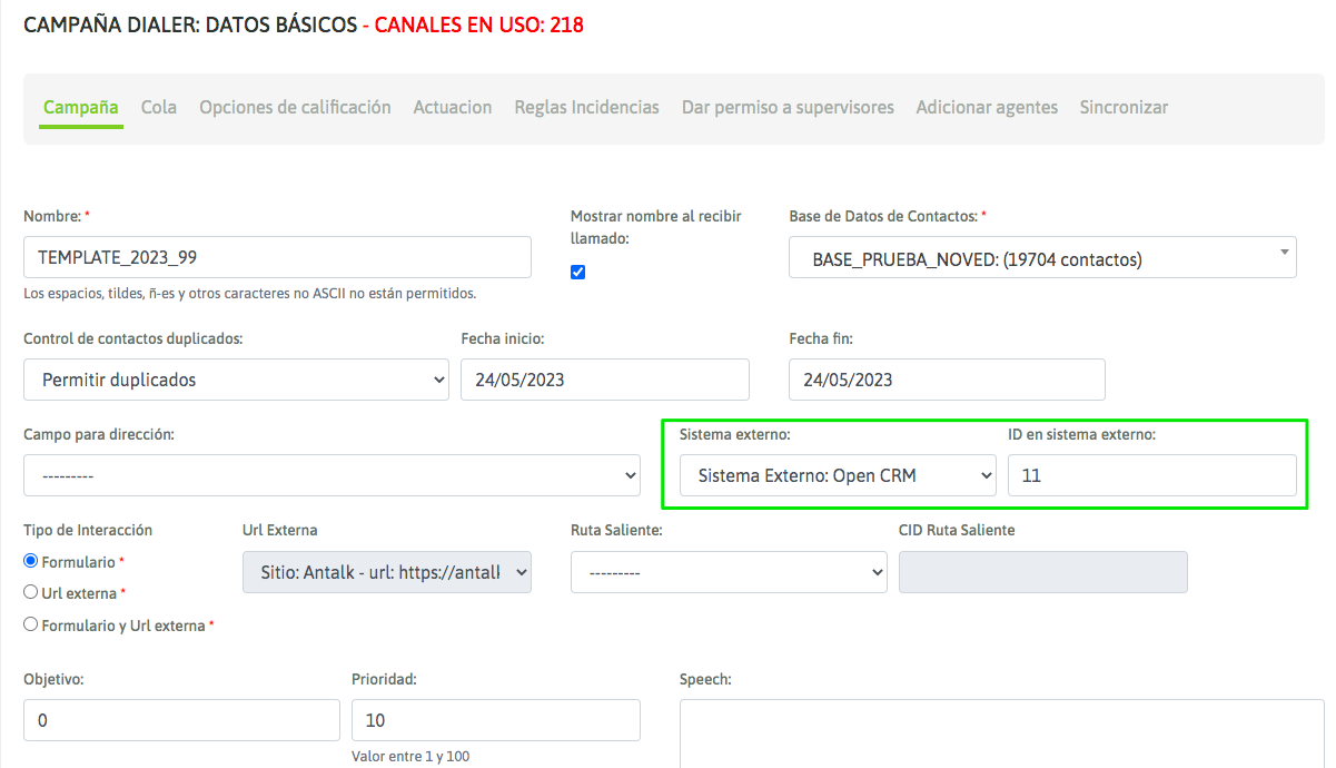 Por lo tanto, se debe seleccionar el CRM que ejecutará las peticiones hacia OML (Sistema externo) por un lado y además se debe indicar el ID de la campaña correspondiente que deseamos vincular (ID en sistema externo). Cada campaña solamente podrá tener una vinculación con una campaña del CRM externo.