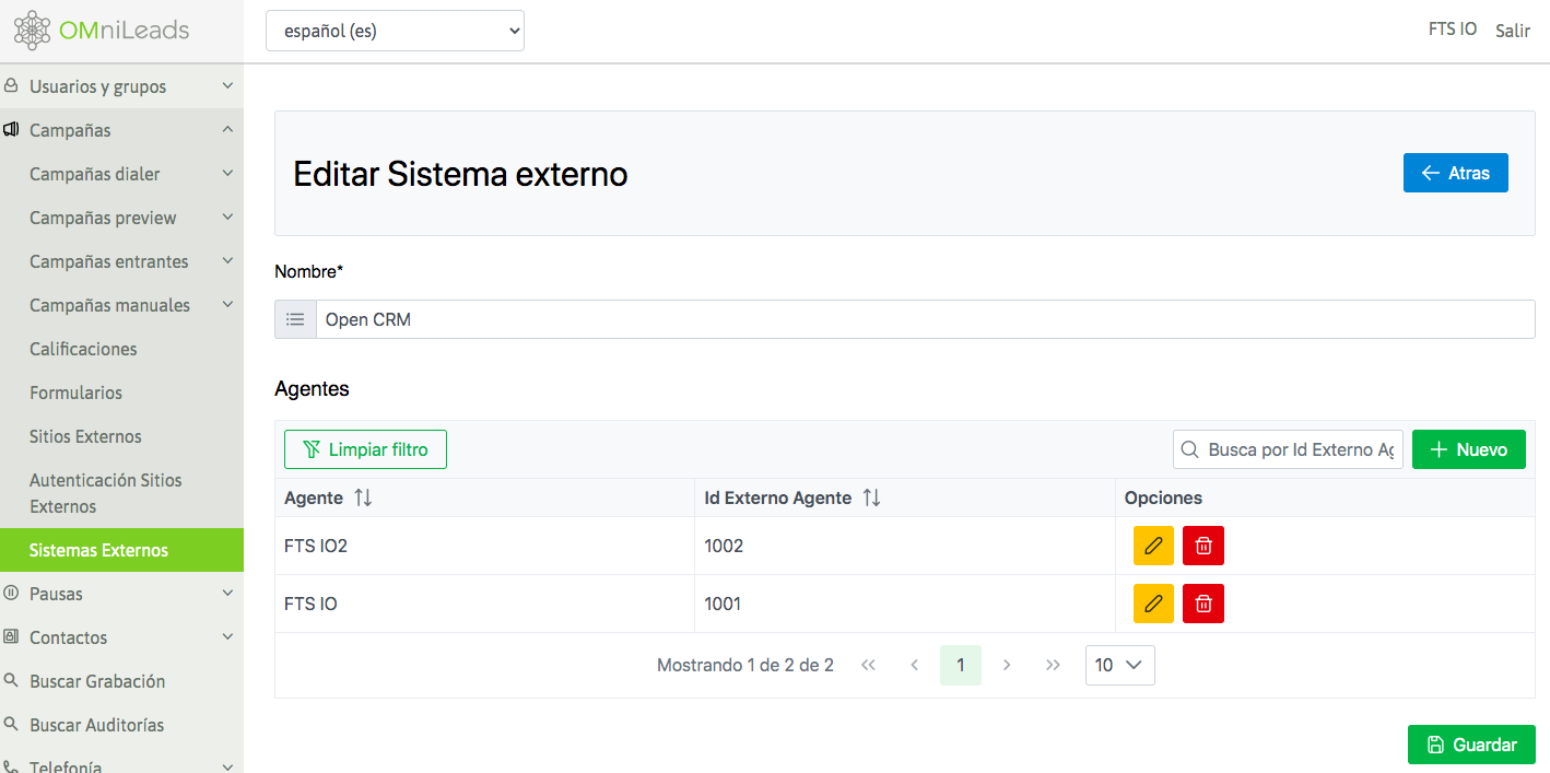 El primer paso es dar el alta de un Sistema Externo y asociar los agentes de OMniLeads con usuarios del CRM a través de ingresar el ID (identificador) del usuario en el CRM, como se indica en la figura 1.