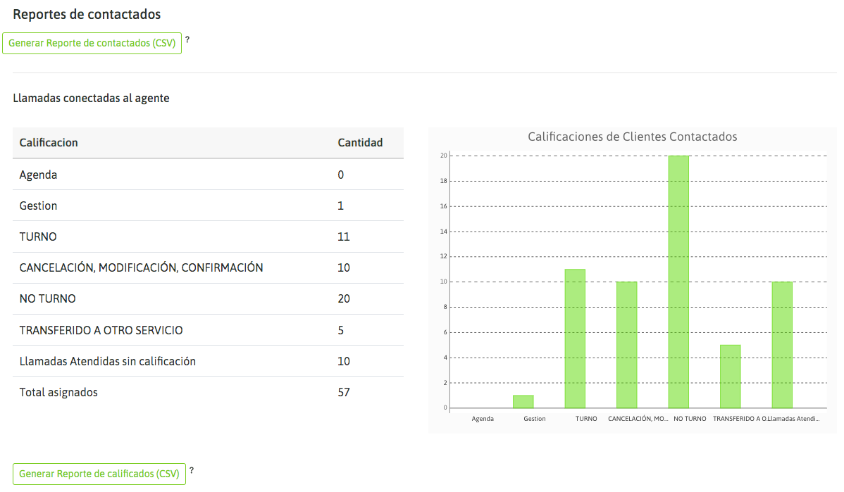 Éste reporte presenta cada contacto gestionado en la campaña junto a la calificación que ha recibido por parte del agente que procesó la llamada asociada al contacto. Además, se puede generar un archivo CSV con las calificaciones ordinarias por un lado, y otro con los contactos cuya calificación recibida fue del tipo «gestión».
