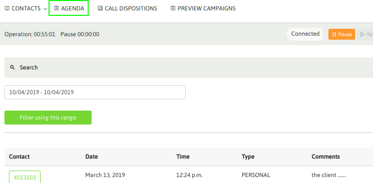 The agent can access his agenda of pending calls to be made. In this section, all the entries that the agent made during the management are listed: