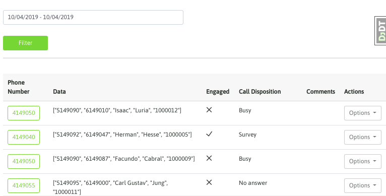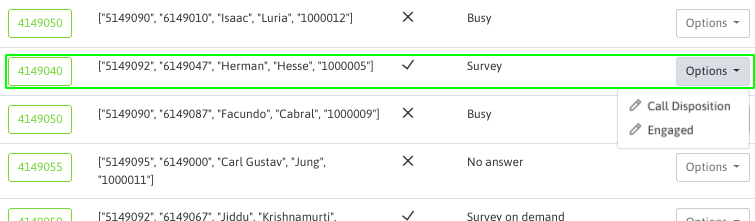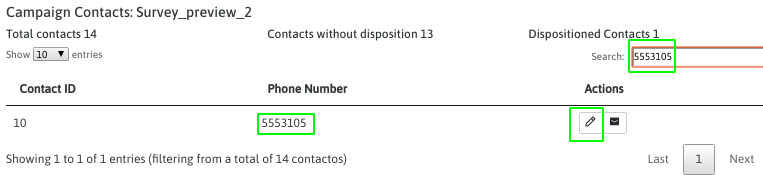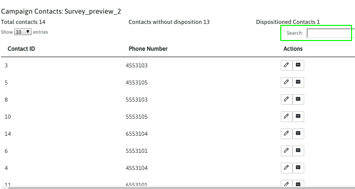 When listing all the campaign contacts, the agent can scroll through each one, or perform a search by contact ID, phone, first name, last name, etc.: