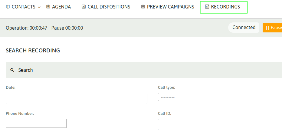 In this menu, the agent will be able to search for recordings of calls in which he has participated: