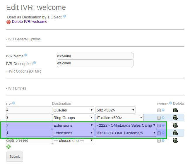 Figure 5: Forwarding to OMniLeads from IVR Although the figure above exemplifies the forwarding of calls to incoming OMniLeads campaigns from a PBX IVR, we can conclude that PBX extensions can also dial or transfer calls to OMniLeads, and that PBX modules such as time conditions, follow me, incoming routes, etc. can invoke a custom PBX extension that forwards calls to OMniLeads.