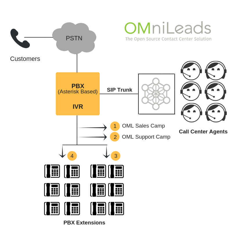 This section illustrates how to configure OMniLeads and an Asterisk-based PBX to route calls from the PBX to OMniLeads.