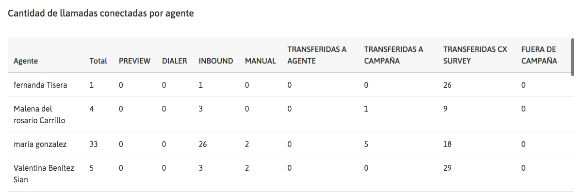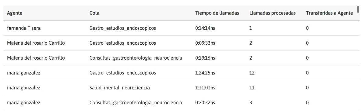 The next parameter to be broken down has to do with the number of calls processed by each agent in terms of campaigns. That is, a detail is presented for each agent of how many calls and how much time they spent on each of the campaigns for which they processed their calls.