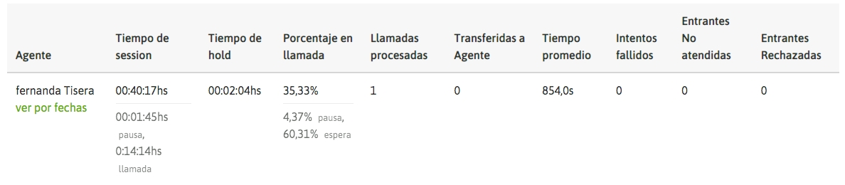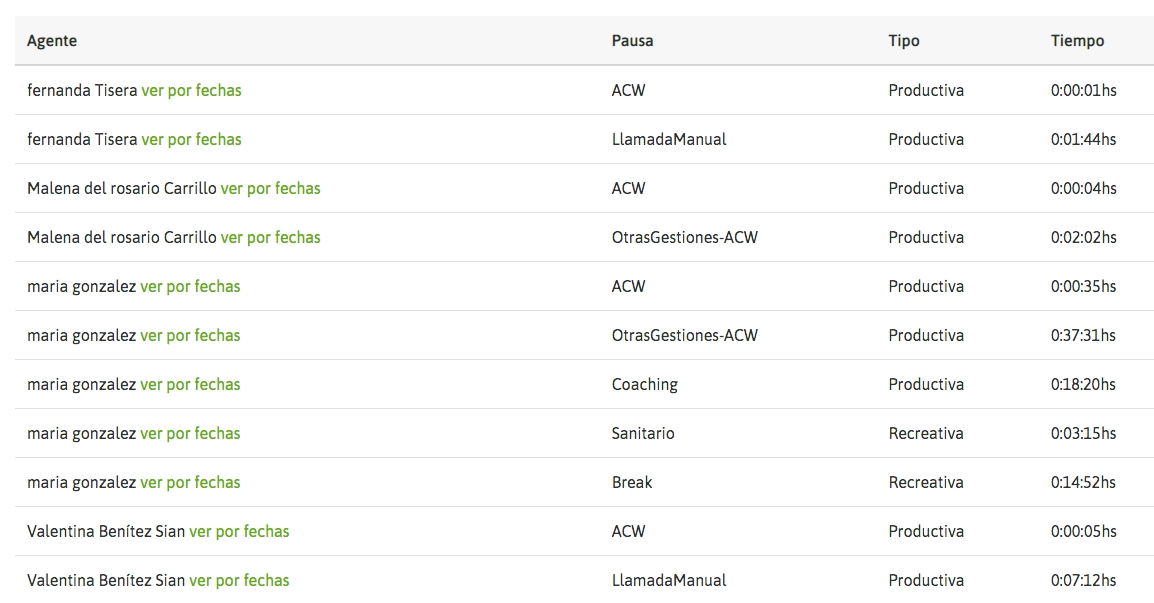 From our summary, we begin to break down the information, such as the accumulated time on pause. Then, the second table that the view presents is a detailed report of the pauses and the time of each one, in which each agent was stopped: