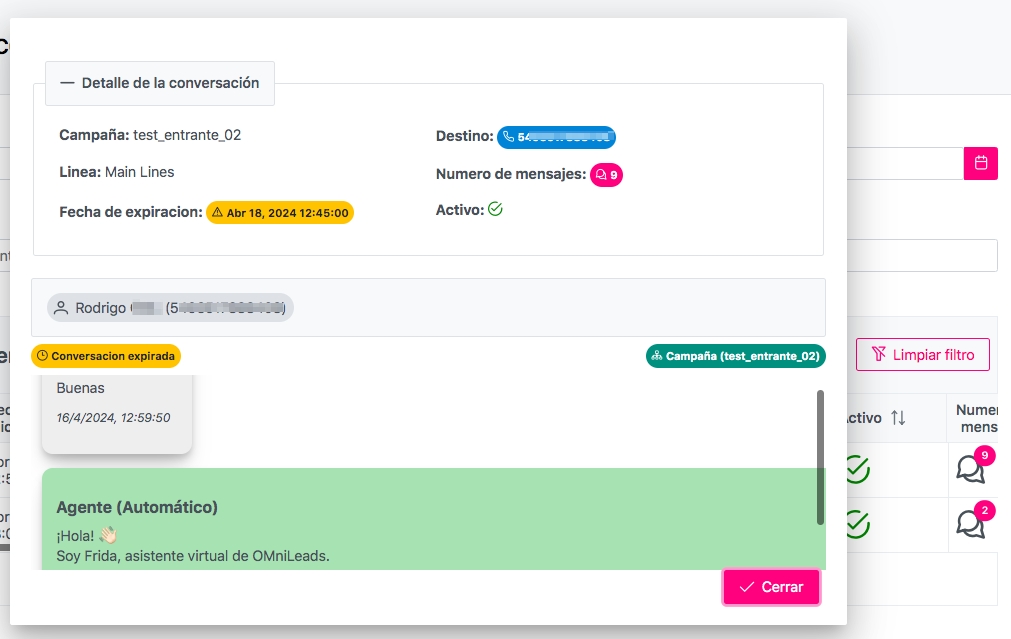 Expiration Date: future date on which the conversation will expire. If it must be resumed, it is necessary to use WhatsApp Outgoing Templates.
