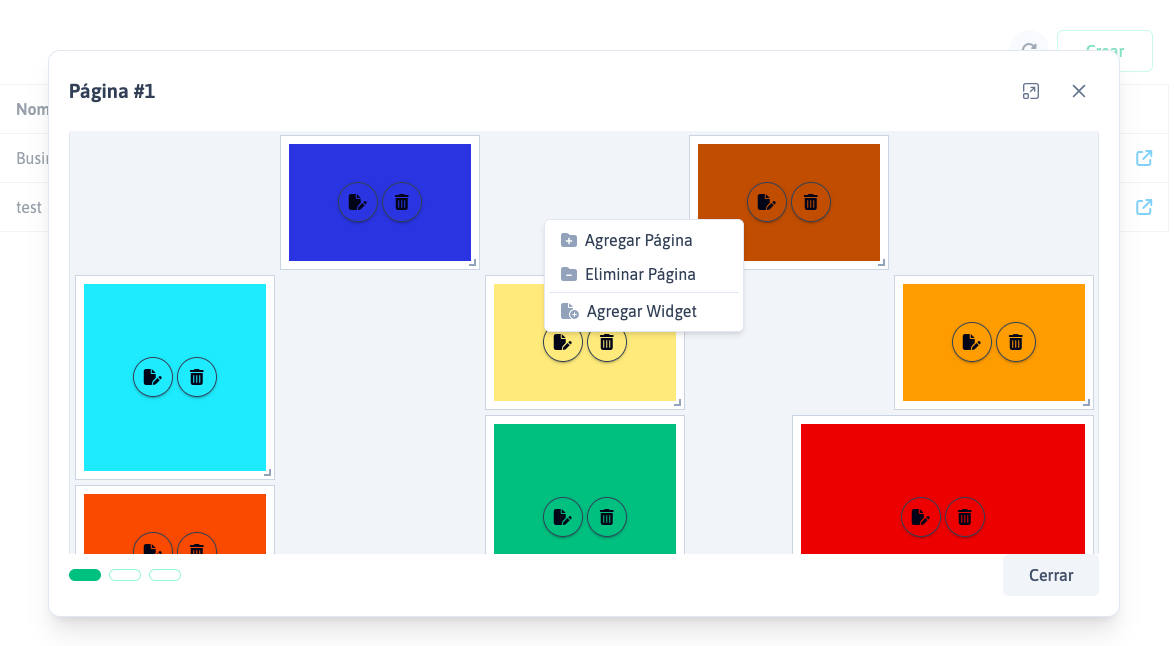 Cuando se agrega un nuevo widget a través del botón "Agregar Widget", éste se agregará a la página en la cual el usuario está posicionado. Las opciones del widget de página permiten borrar el widget, o bien editarlo/configurarlo.